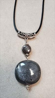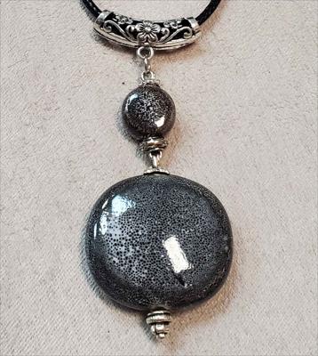 Серый кулон из керамики из дутой большой бусины и маленькой таблетки собран вручную.